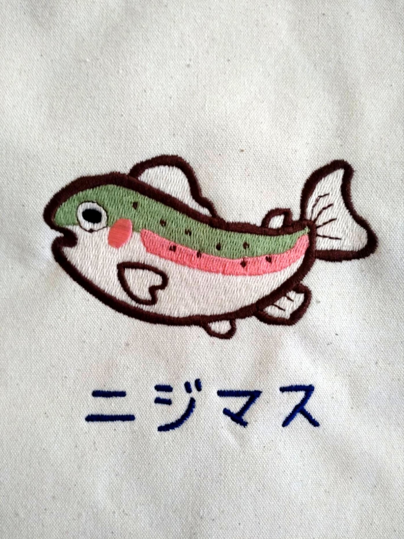ユナイテッドアスレのトートバッグにニジマスを刺繍しました。