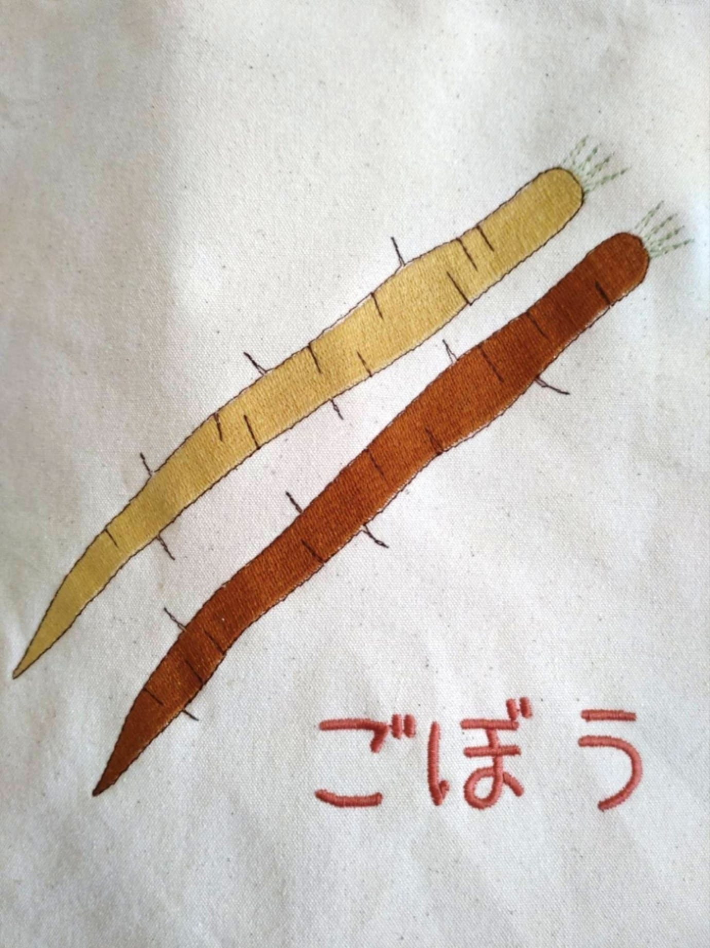 ユナイテッドアスレのトートバッグにごぼうを刺繍しました。